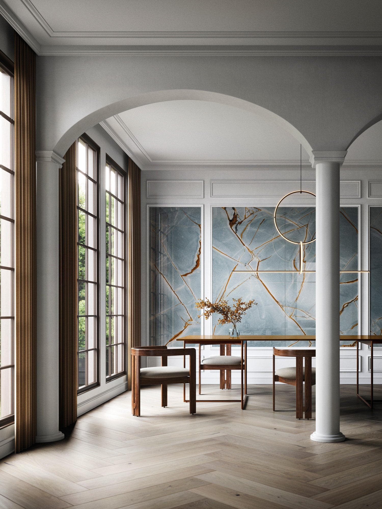 With a captivating design and charged with visual strength, Blue Roma intertwines sumptuous coppery veins on its distinctive greyish-blue canvas. The collection fills rooms with a natural aesthetic with a distinguished character, enhancing blue quartzite as a true masterpiece.